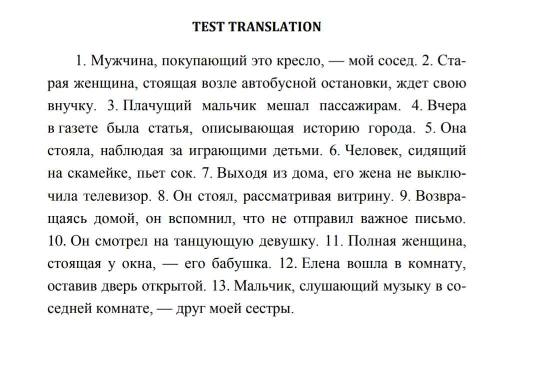 l. The man who buys this chair, my neighbor, 2, the Old Woman, standing near the bus stop, is waiting for his granddaughter. Z. Crying boy interfered with passengers. 4. Yesterday the newspaper was an article describing the history of the city. 5.She stood watching the children playing. 6. A person sitting on a bench drinks juice. 7. Coming out of the house, his wife did not turn off the TV. 8. He stood looking at the shop window. 9. Returning home, he remembered that he had not sent an important letter 10. He was looking at the dancing girl. 11. Fat woman standing at the window, his grandmother. 12. Elena entered the room, leaving the door open. 13 . A boy listening to music in the next room is my sister's friend.