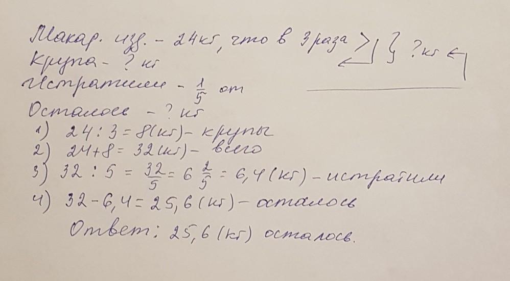 Помогите пожалуйста! В школьную столовую закупили 24 кг макаронных изделий что в три раза больше чем крупы. Пятую часть покупки истратили. Сколько кг макаронных изделий и крупы осталось