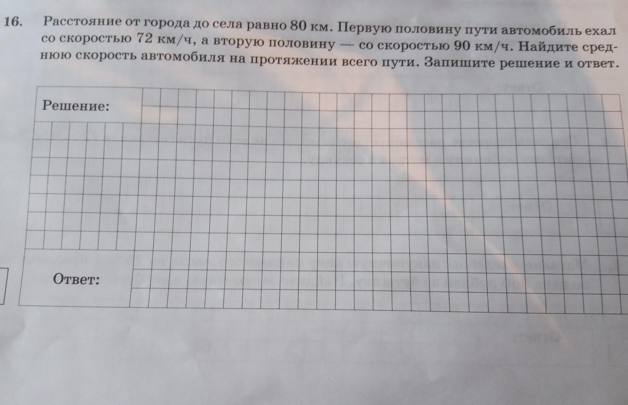 расстояние от города до села равно 80 км первую половину пути автомобиль ехал со скоростью 72 км ч а вторую половину со скоростью 90 км ч найдите среднюю скорость автомобиля на протяжении всего пути запишите решение ответ даю 13 баллов!!!