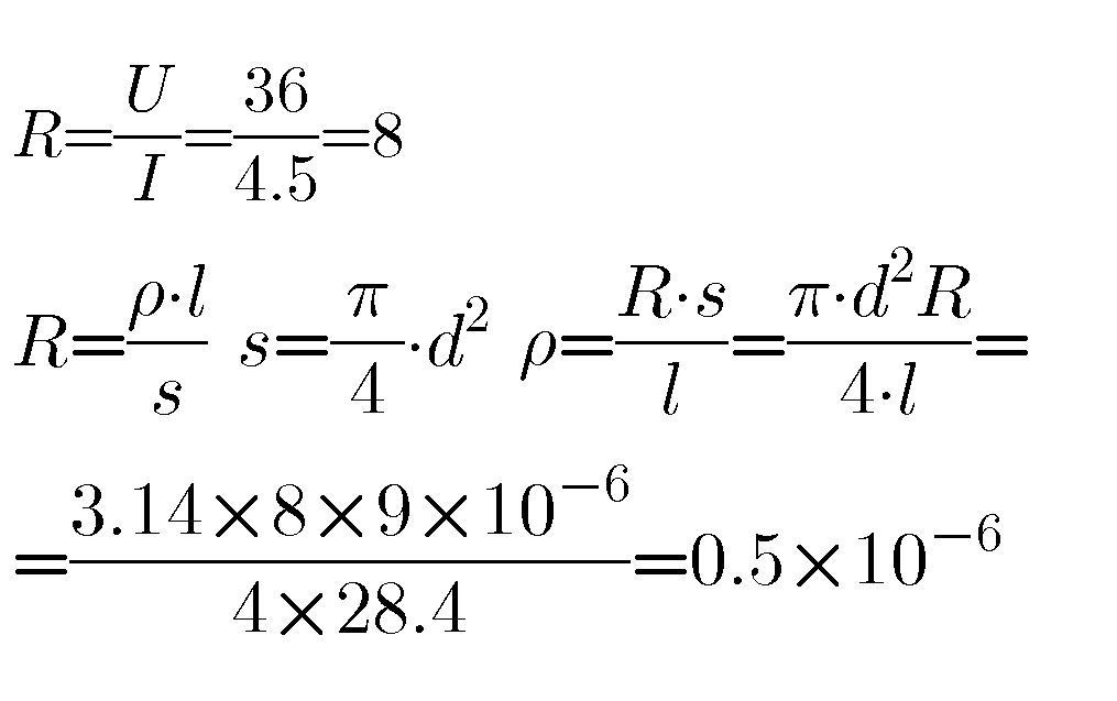 Определите удельное сопротивление провода,если известны его диаметр (3*10 в степени -3) и длина (28,4м),а при напряжении 36 В в нем устанавливается ток 4,5 А.