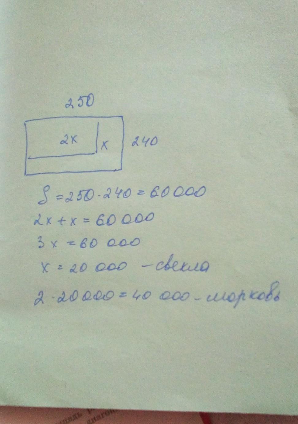 Пошаговое объяснение: 1) 240*250=60 000 кв м -общая площадь участка Пусть х-площадь под свеклой,тогда 2х-под морковью.Составим уравнение: х+2х=60 000 3х=60 000 х=60 000:3 х=20 000(кв.м)-площадь по свеклой 20 000* 2=40 000(кв.м.)- участок под морковью