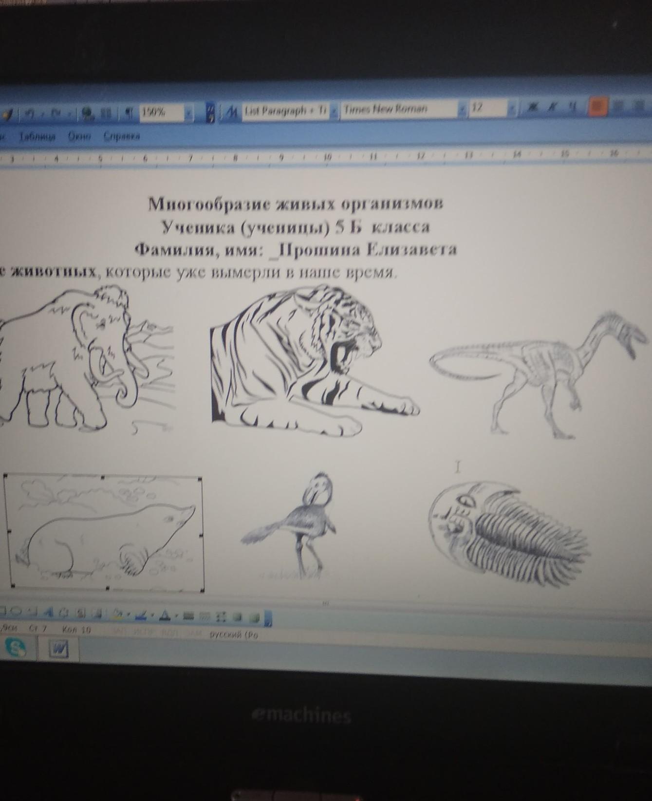 Мамонта надо закрасить, динозавра. Получается 1 рисунок 3 рисунок 5 или 6. Не могу понять что на 6 рисунке
