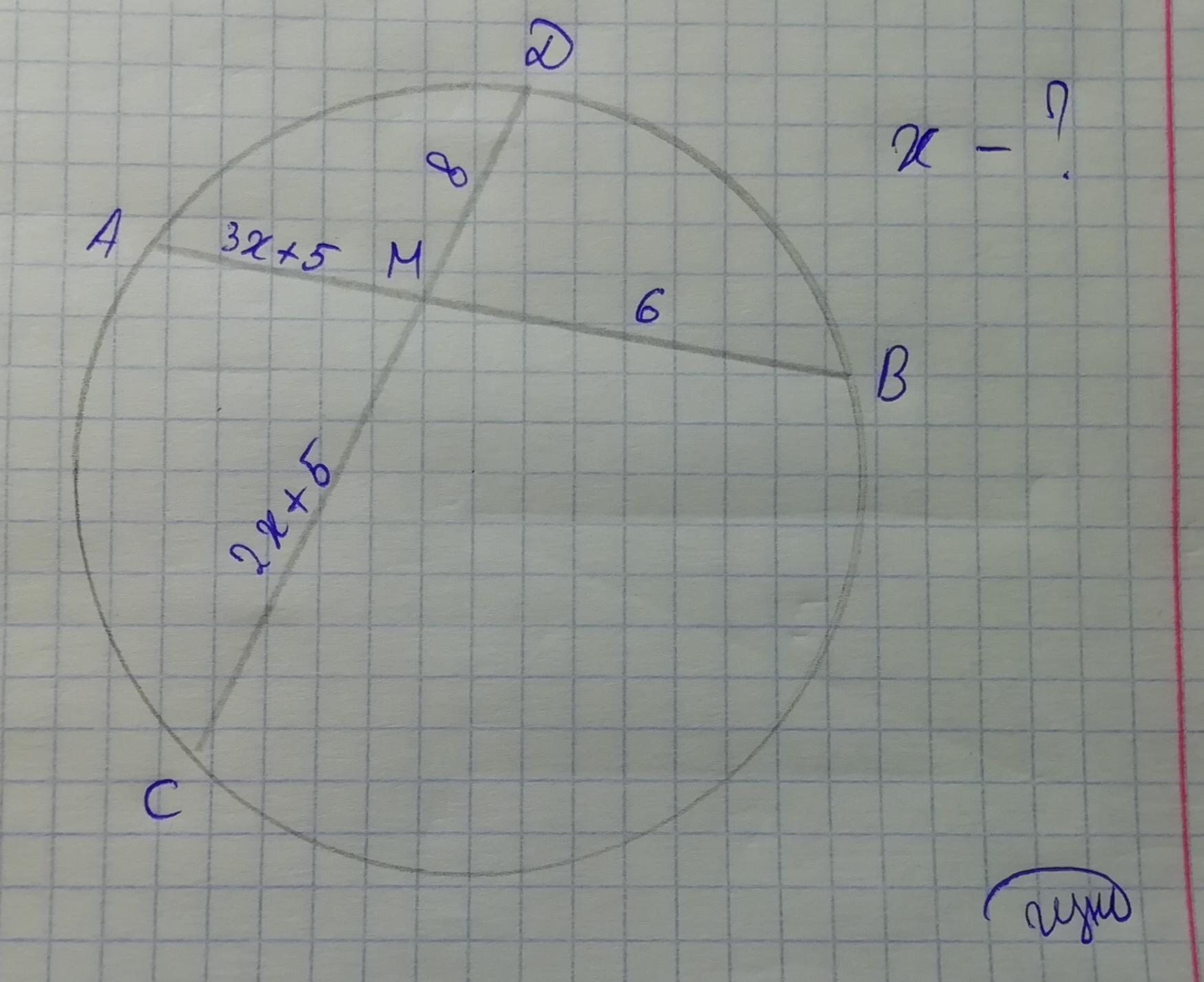 Дано: Хорды AB и CD пересекаются в точке M, AM = 3x + 5, MB = 6 см, CM = 2x + 5, MD = 8 см.