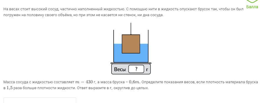 Так как брусок подвешен, то его массу не учитываем (считаем что пол объема бруска заполнено водой), масса воды прибавилась (за счет вытеснения бруском).