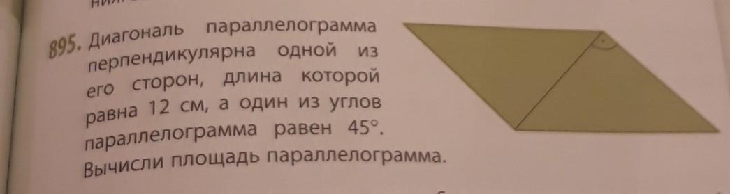 диагональ параллелограмма перпендикулярна одной из его сторон, длина которой равна 12 см, а один из углов параллелограмма равен 45°.Вычисли площадь параллелограмма.