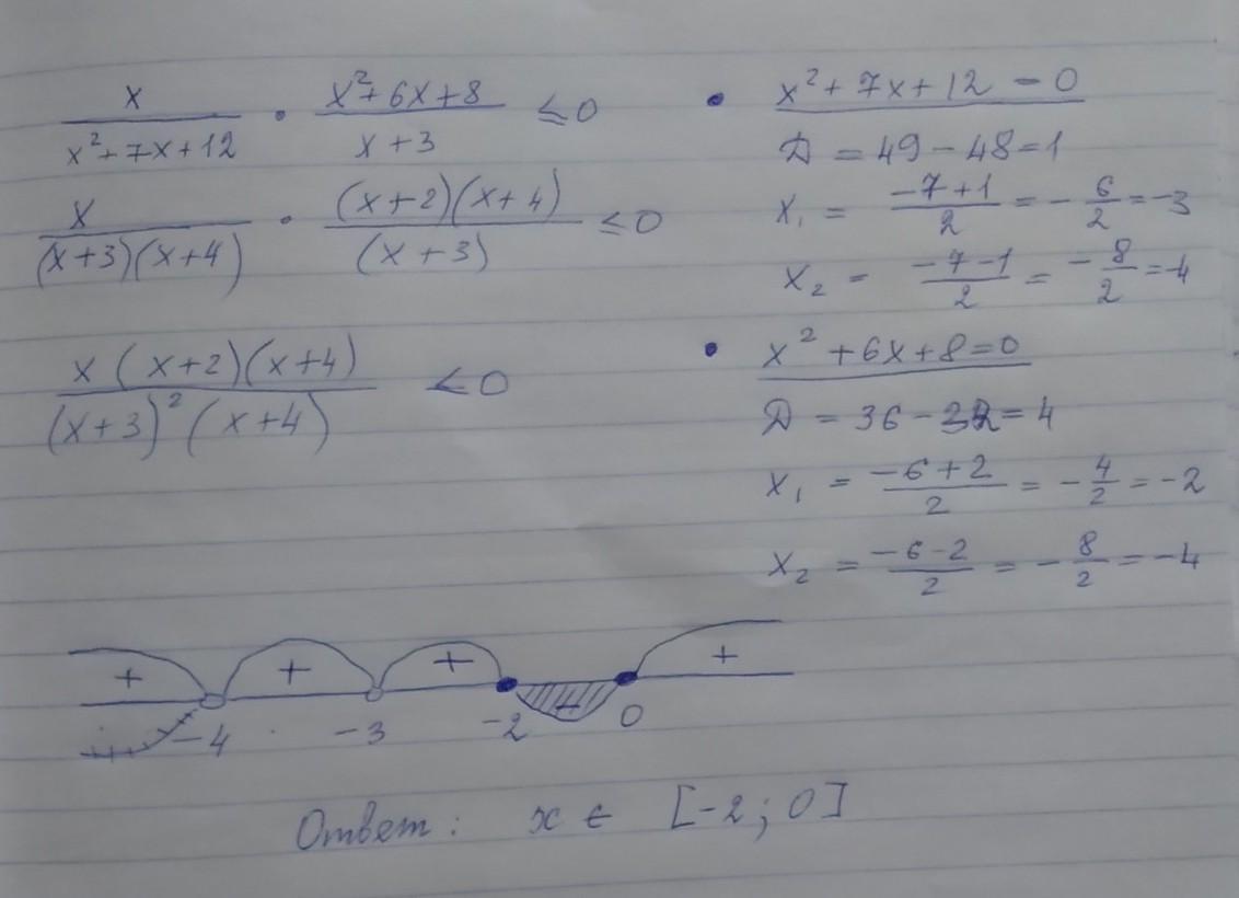 Задача:Найти сумму всех целых решений неравенства (x/x²+7x+12)*[(x²+6x+8)/(x+3)]≤0.