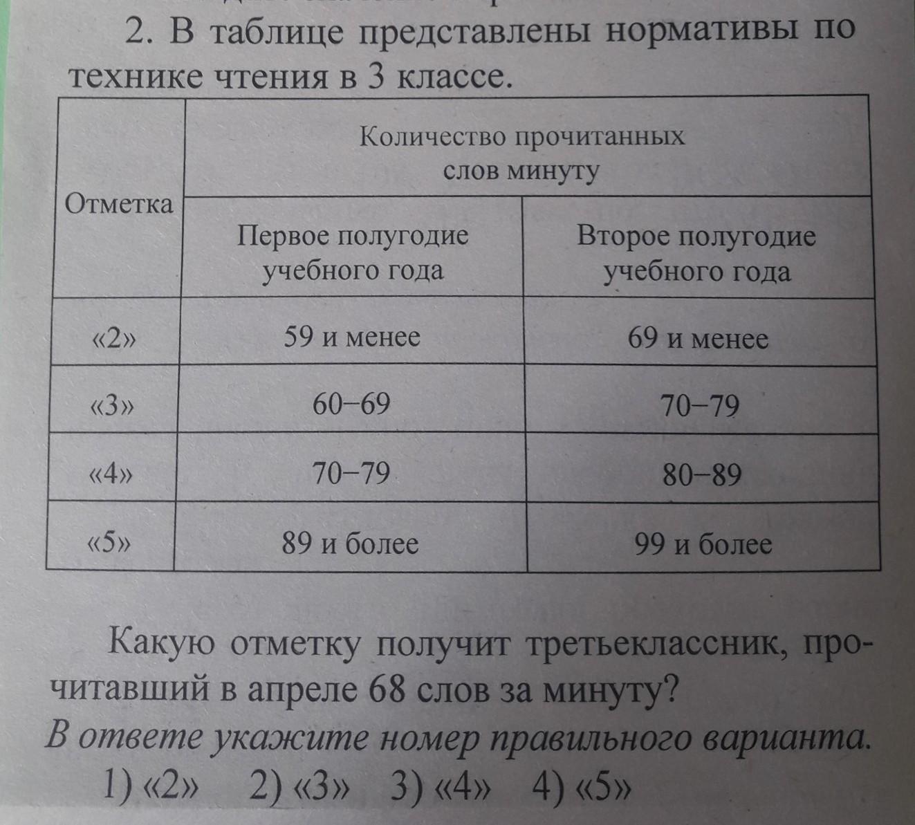 В таблице представлены нормативы по технике чтения в 3 классе.Какую отметку получит третьеклассник,прочитавший в апреле 68 слов за минуту?В ответе укажите номер правильного варианта.1)《2》;2)《3》;3)《4》;4)《5》.