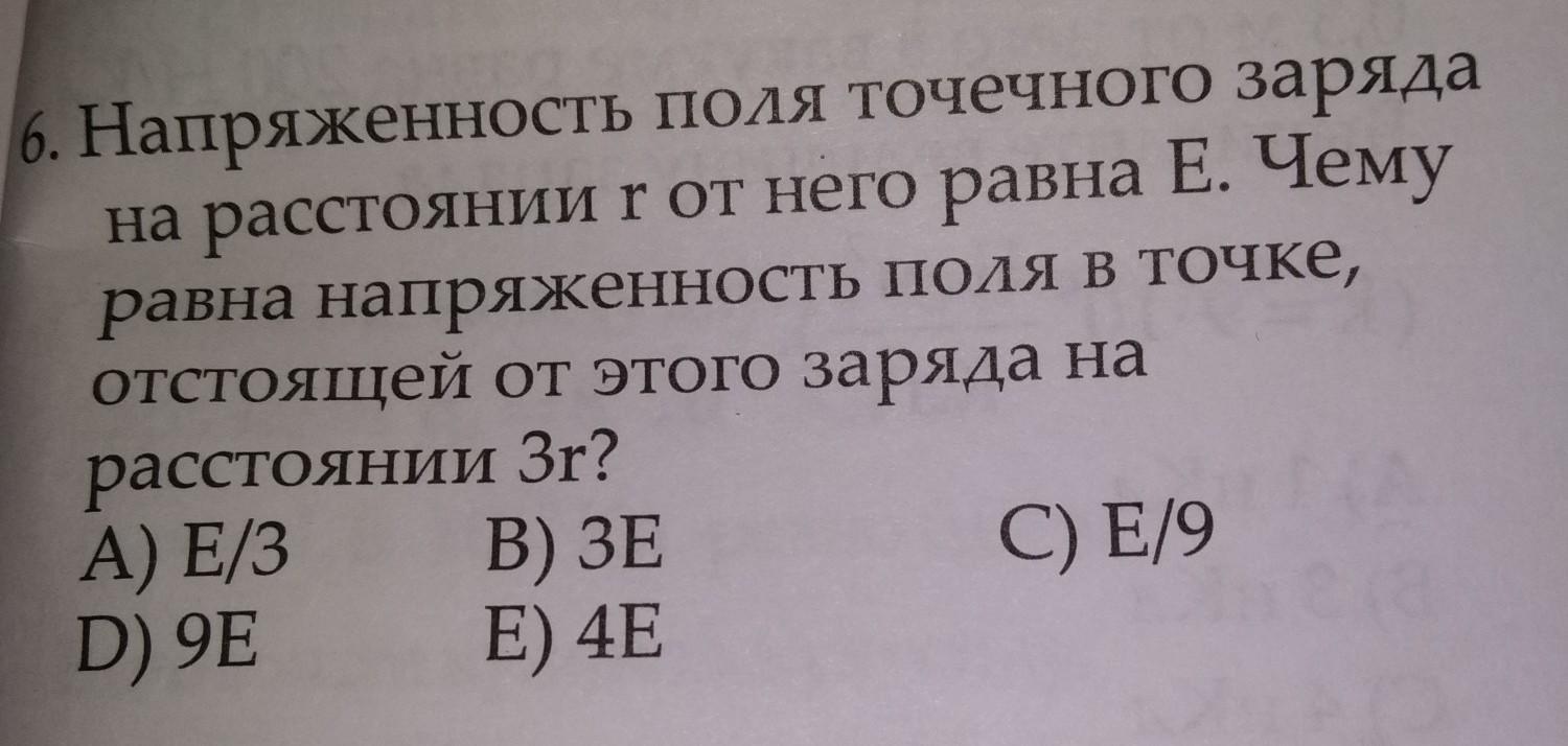 Напряженность рассчитывается по формуле E=k*q/r^2 Подставим 3*r: E=k*q/9*r^2 Выбираем ответ С)