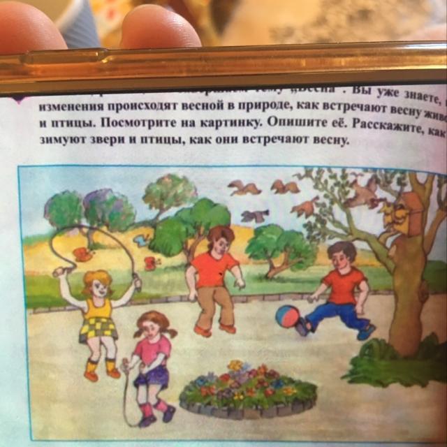 На квартире нарисованы дети которые занимаются своими делами. Сейчас осень так так птицы улетаю и очень ветерно. Но если дети легко одеты то значит это начало сентября.