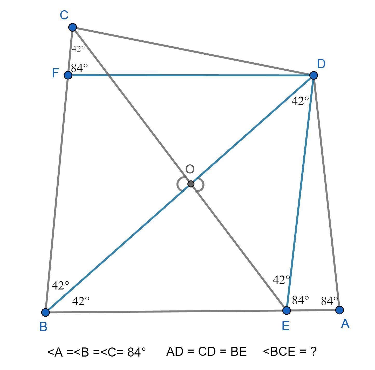 в выпуклом четырехугольнике ABCD углы при вершинах A, B и C равны по 84°. На стороне AB отмечена точка Е. Известно, что AD=CD=BE. Найдите угол BCE