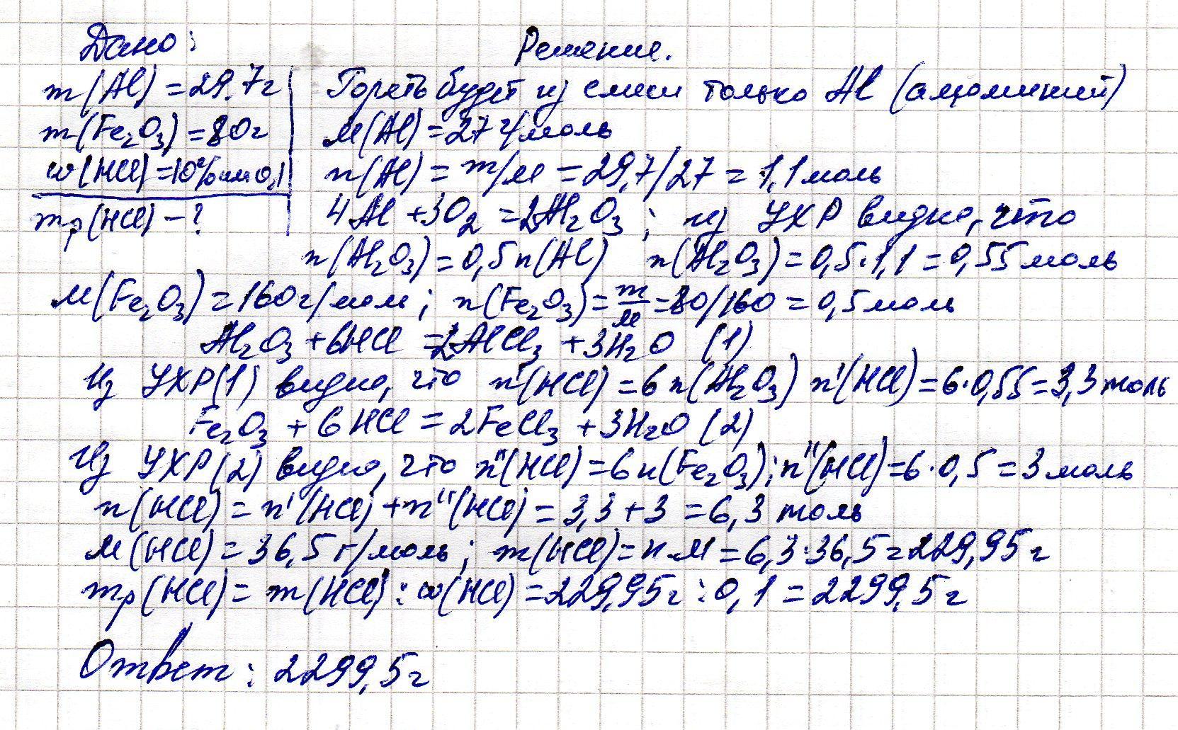 ДАЮ 50 БАЛЛОВ. Навеску смеси 29,7 г алюминия и 80 г оксида железа (III) подожгли и дождались окончания реакции. Вычислите массу 10%-ного раствора соляной кислоты, необходимого для полного растворения полученного вещества. Ответ приведите в граммах и округлите до десятых. (Ответ: 1934,5)
