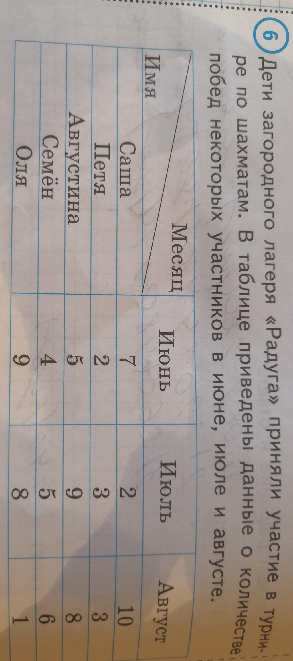дети загородного лагеря радуга приняли участие в турнире по шахматам. в таблице приведены данные о количестве побед некоторых участников в июне, июле и августе. 1) у кого было больше наименьшее количество побед в июне? 2) сколько побед одержал участник, занявший 1место по итогам турнира? ответ