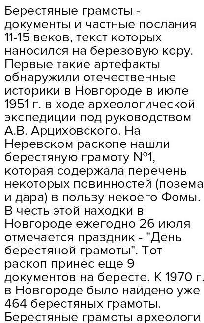 Берестяные грамоты представляют собой письма или записи на коре березы.Берестяные грамоты являются памятником культуры Древней Руси.Они также являются источниками информации для историков и археологов.Местом,где впервые была обнаружена такая грамота ,стал Великий Новгород.Средневековые люди писали на коре березы,как мы пишем на бумаге.Берестяные грамоты использовались летописцами,для описывания событий,происходящих в в жизни народа,священниками написания церковных текстов.Огромную известность получили обнаруженные в 1956 году учебные записи и рисунки новгородского мальчика Онфима. Берестяная письменность известна также ряду других культур народов мира.