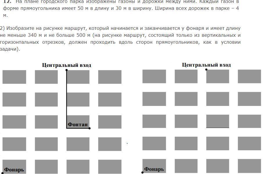 3. Изобразите на рисунке маршрут который начинается и заканчивается у фонаря и имеет длину не меньше 340 м и не больше 500 м (на рисунке маршрут состоящий только из вертикальных и горизонтальных отрезков должен проходить вдоль сторон прямоугольников как в условии задачи )