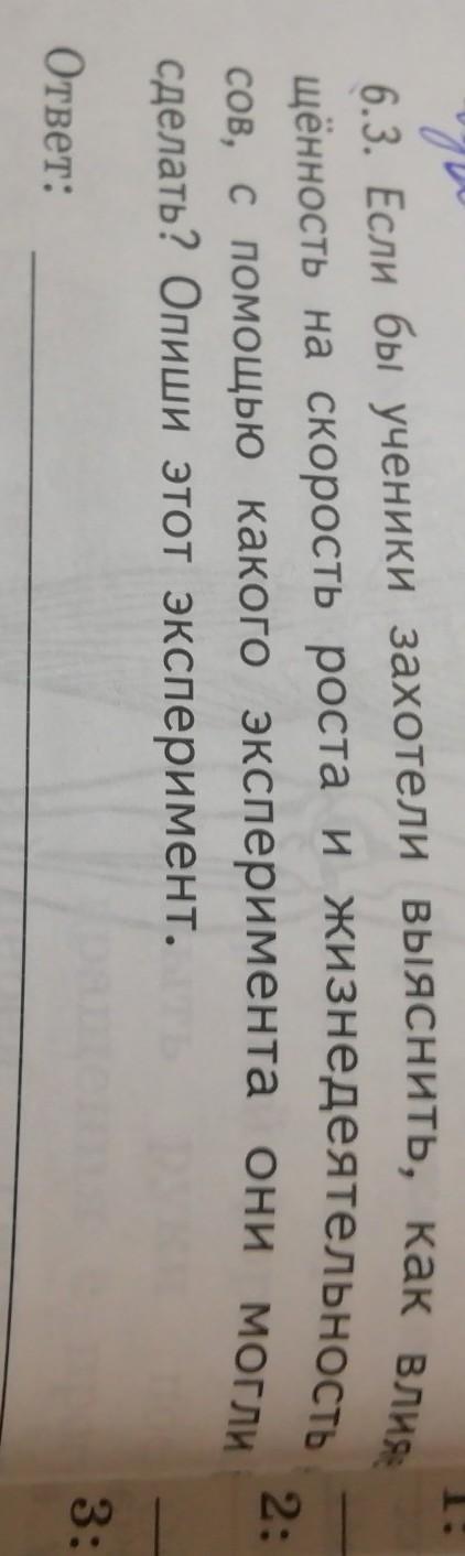 ЭЙЙ бро помоги! У меня задача тут 15 балов дам за помощь! Решите по фото 6.3(есле что-то не понятно спросите) задача :ученики 4 класса проводили опыты Они хотели выяснить как влияет вода на скорость роста и жизнедеятельность растений школьники поставили рядом на подоконник 2 горшка в каждом из которых паровоз побег нарцисса одном горшке. В одном горшке ребята поливали цветок каждый день во втором один раз в неделю