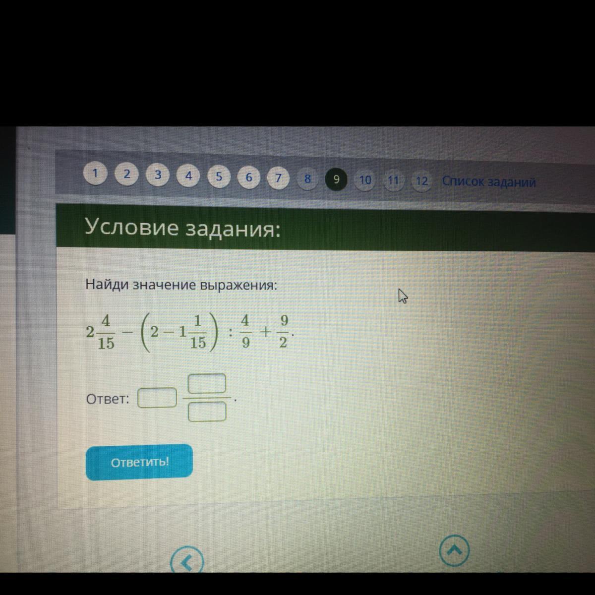 2 4/15- 14/15×9/4+9/2= 34/15-(14×9):(15×4)+9/2=(68-63+9×15)÷30=(1+27)÷6=14/3=4 2/3.