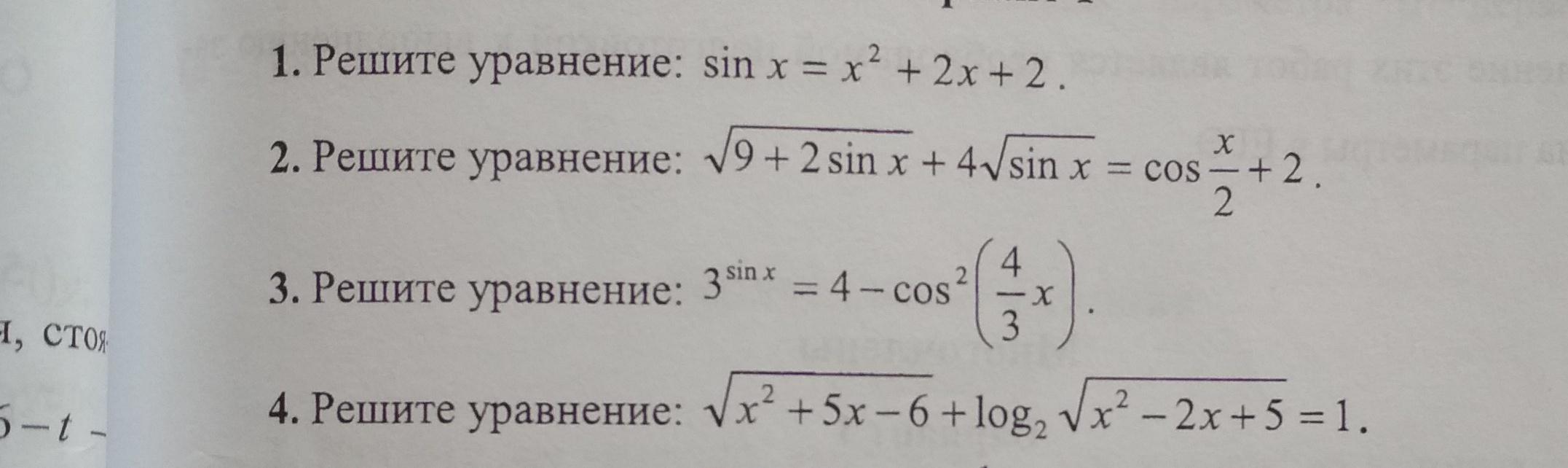 1) Левая часть меньше либо равна 1, правая часть больше или равна 1. Поэтому равенство возможно только в случае, когда обе части равны 1. Правая часть равна 1 при x= - 1. Однако левая часть при этом значении x не равна 1. Более того, она меньше нуля. Вывод: решений нет.