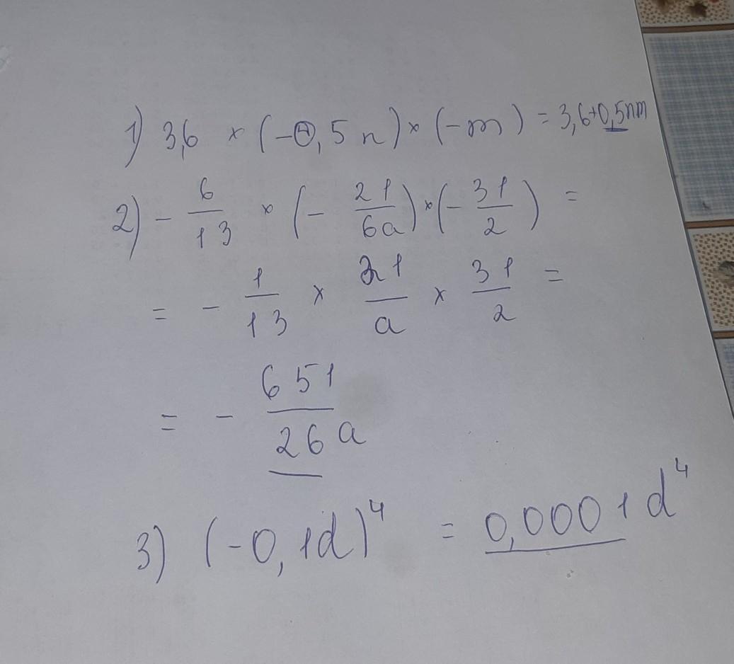 1) 3,6*(-0,5n)*(-m)=3,6+0,5nm(подчеркнуть 0,5)