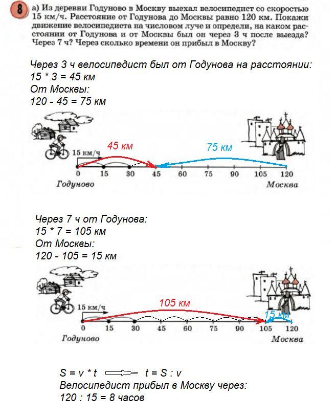 Из деревни Годуново в Москву выехал велосипедист со скоростью 15 км/ч. Расстояние от Годуново до Москвы ровно 120 км. От Годуново до Москвы был через 3 часов после выезда? Через 7 часов? Через сколько времени он прибыл в Москву????