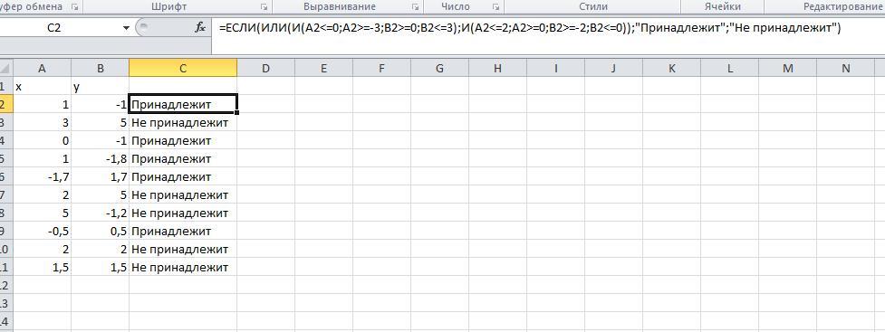 =ЕСЛИ(ИЛИ(И(A2<=0;A2>=-3;B2>=0;B2<=3);И(A2<=2;A2>=0;B2>=-2;B2<=0));"Принадлежит";"Не принадлежит")