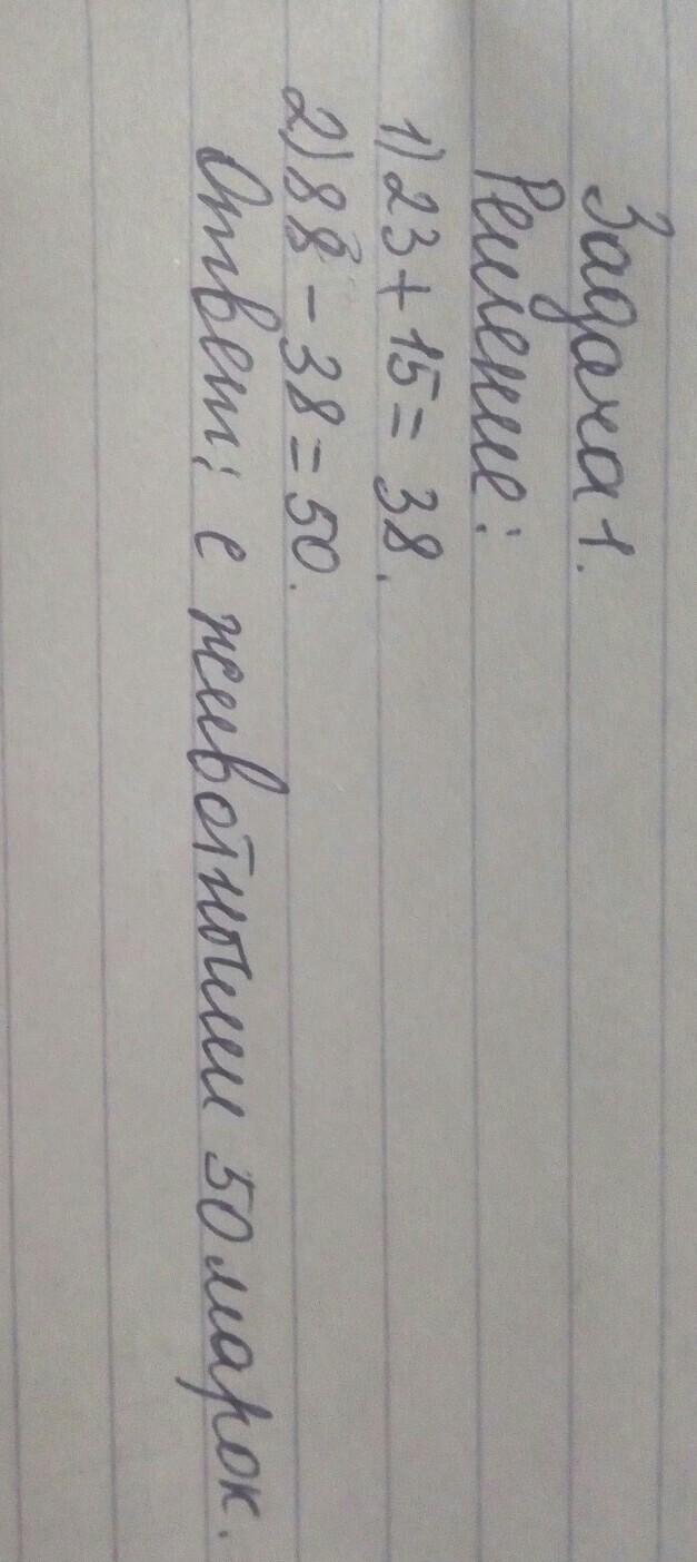 ПОМОГИТЕ(МОЕМУ БРАТУ) 2-ОЙ КЛАСС :В коллекции у Миши 23 марки с героями мультфильмов, 15 марок со спортивными машинами, а остальные марки — с животными. Сколько у Миши марок с животными, если всего у него 88 марок?