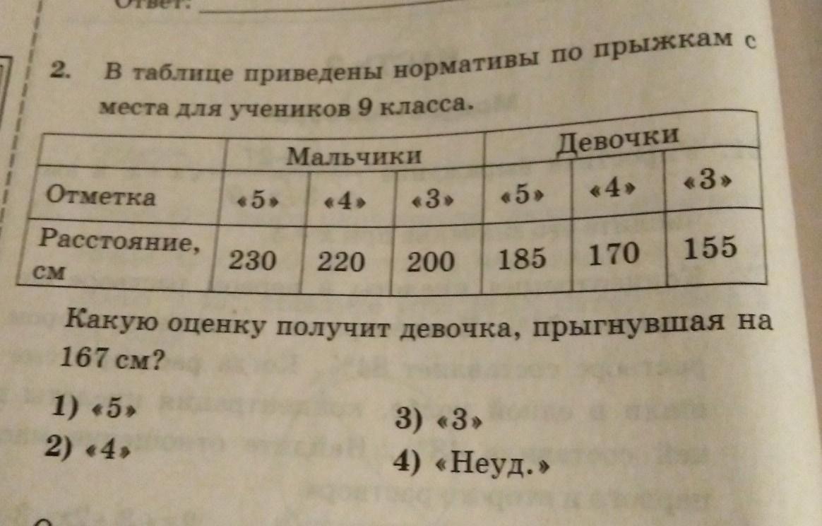 Девочка прыгнувшая на 167 см получит оценку 3, т.к. первая девочка получила оценку 5, с расстоянием 185 см, а третья 3 и она прыгнула на расстояние 170 см. тоесть норма для девочек претиндующих на оценку 4, должна состовлять не меньше 170 см.