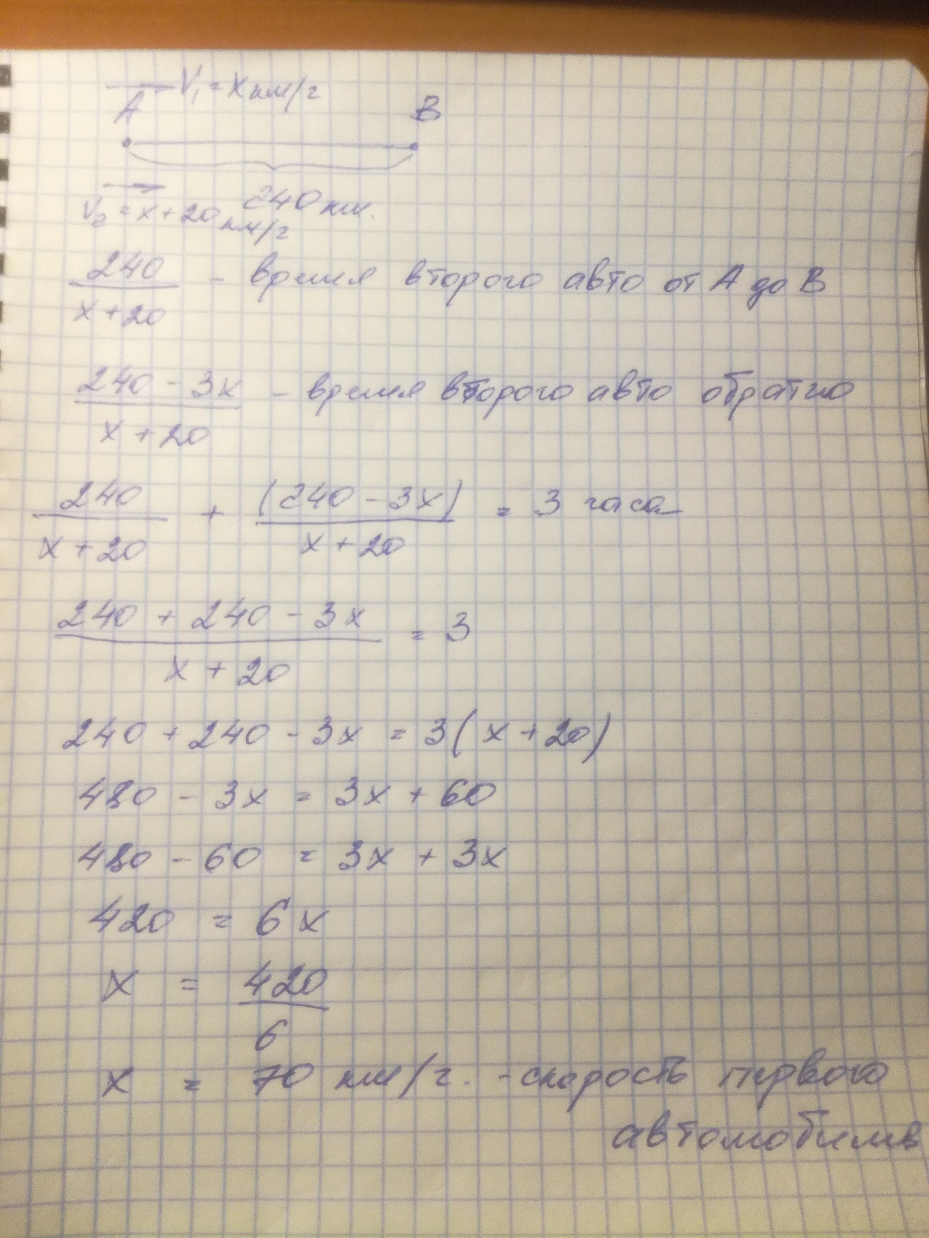 Из пункта А в пункт В, расстояние между которыми равно 240км, одновременно выехали два автомобиля. Скорость первого автомобиля на 20км/ч больше скорости второго. Первый автомобиль, прибыв в пункт В, сразу же отправился обратно и встретил второй автомобиль через 3 часа после выезда из пункта А. Найдите скорость первого автомобиля.