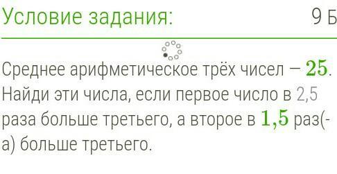 средние арифмитическое 3 чисел = 25 найдите эти три числа если первое число в 2,5 больше чем третие , а второе в 1,5 больше третего