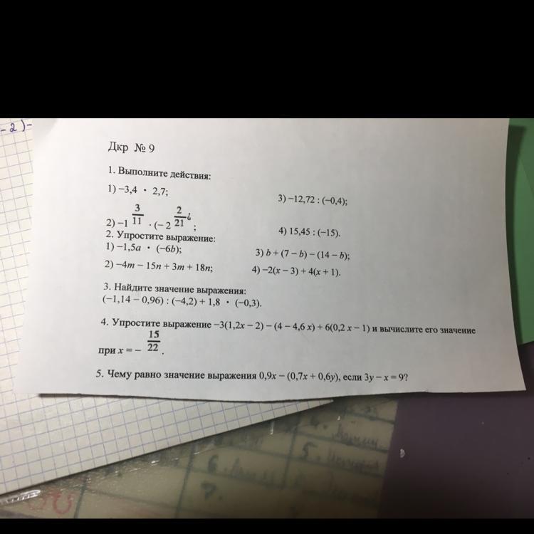 4) -3.6x+6-4+4.6x+1.2x-6 = 2.2x-4 =( -22/10 × 15/22) - 4 = -1.5 - 4 = - 5.5