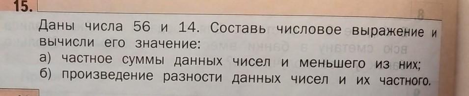 даны числа 56 и 14 составь числовое выражение и вычисли его значение частное суммы данных чисел меньшее из них