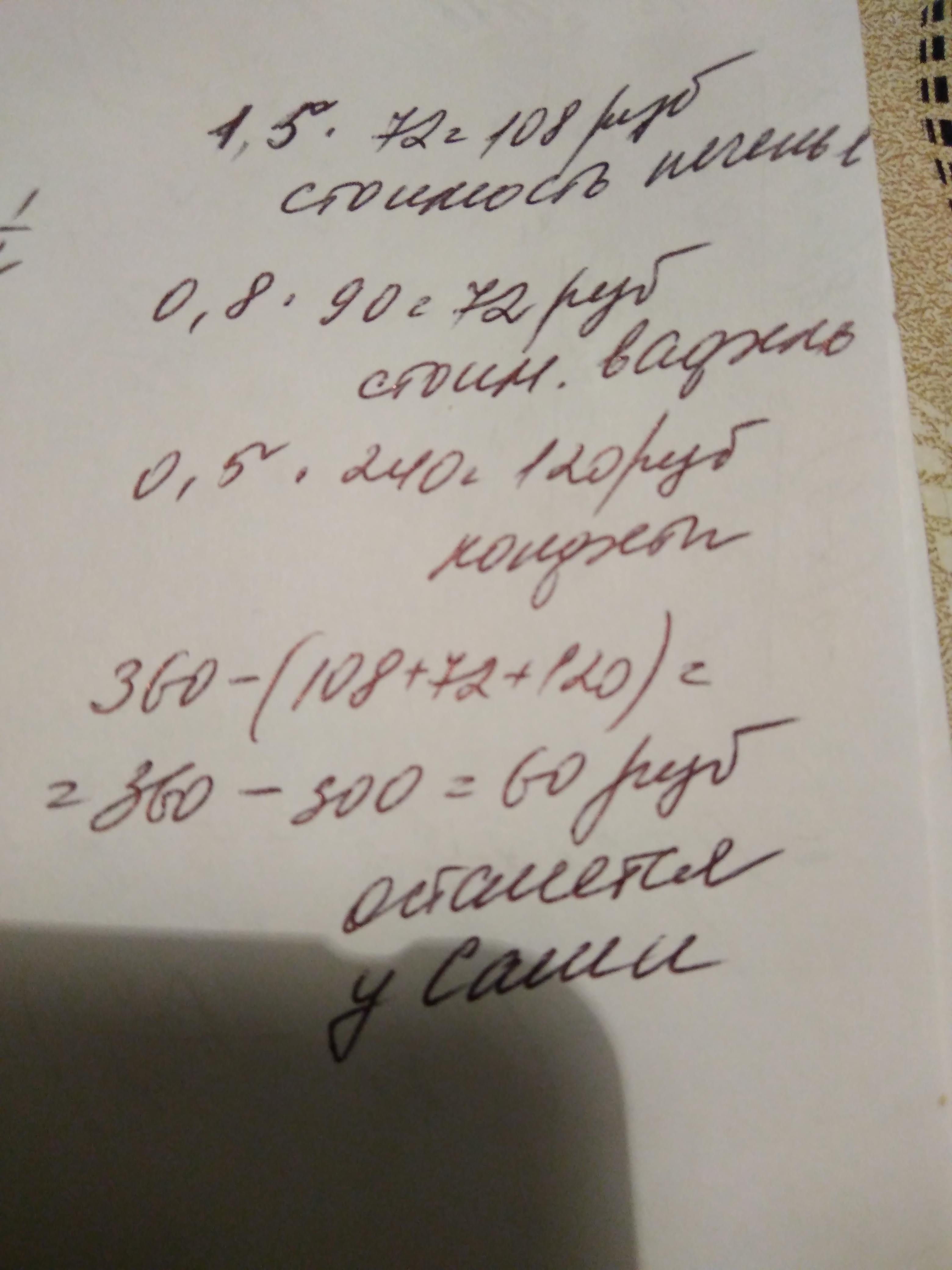 Мама поручила Саше купить 1,5 кг печенья, 0,8 кг вафель и 0,5 кг конфет. Хватит ли Саше 360 р. , если 1 кг печенья стоит 72 р. , 1кг вафель - 90 р. , а 1 кг конфет - 240 р. ? ПОМОГИТЕ ПОЖАЛУЙСТА!!!!!!!!