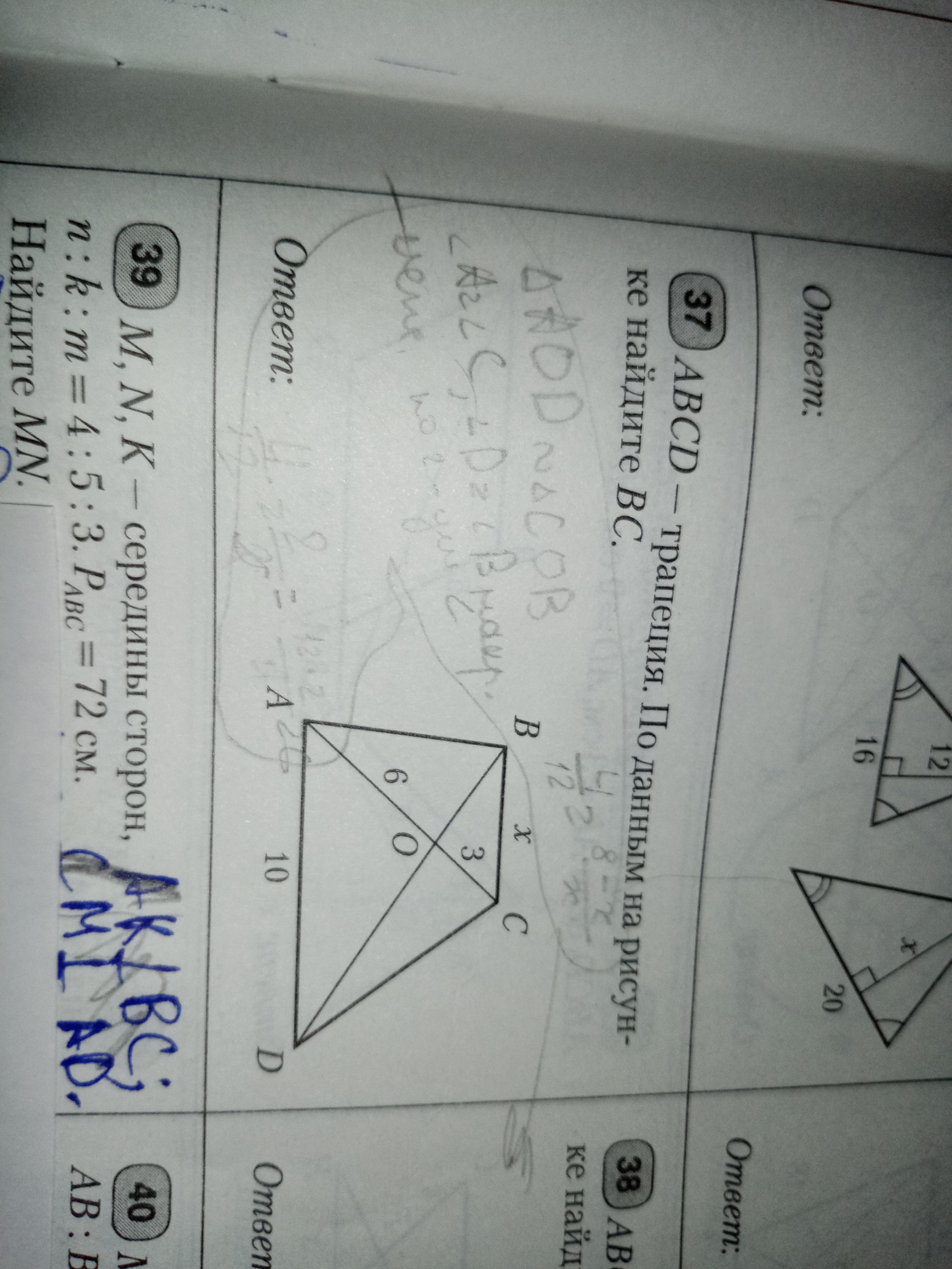 1) ∠АОД=∠ВОС как вертикальные, 2) ∠ДАО=∠ВСО как внутренние накрест лежащие при ВС║АД и секущей АС, составим и решим пропорцию.