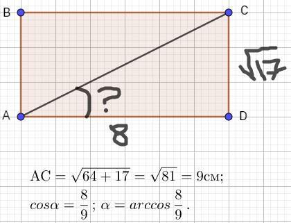 Знайти діагональ прямокутника і кут між діагоналлю та більшою стороною якщо його сторони дорівнють 8см і корінь 17.