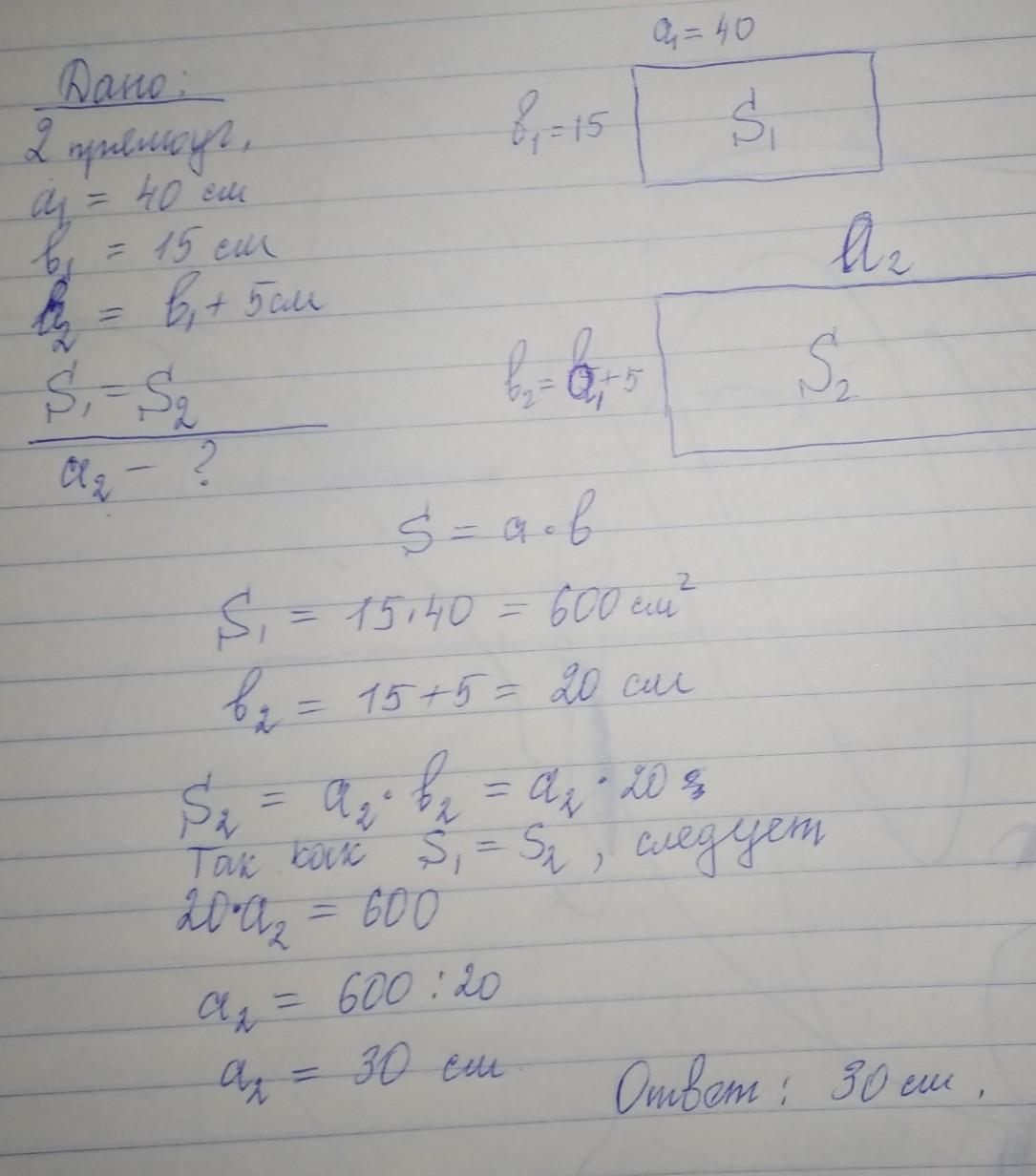 Длина первого прямоугольника равна 40 см ширина 15 см Ширина второго прямоугольника на 5 см больше чем ширина первого А их площади равны Найдите длину второго прямоугольника Как решить с условием