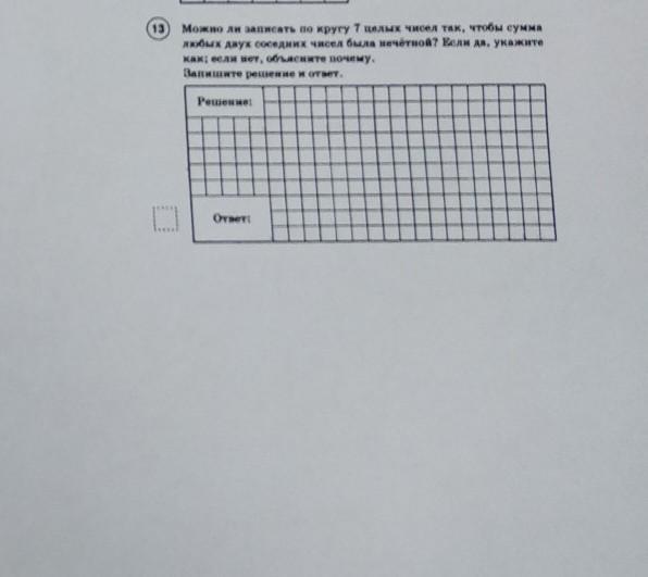 Можно ли записать по кругу 7 целых чисел так, чтобы сумма любых двух соседних чисел была нечётной?Нсли да, укажите как:если нет, объясните почему.