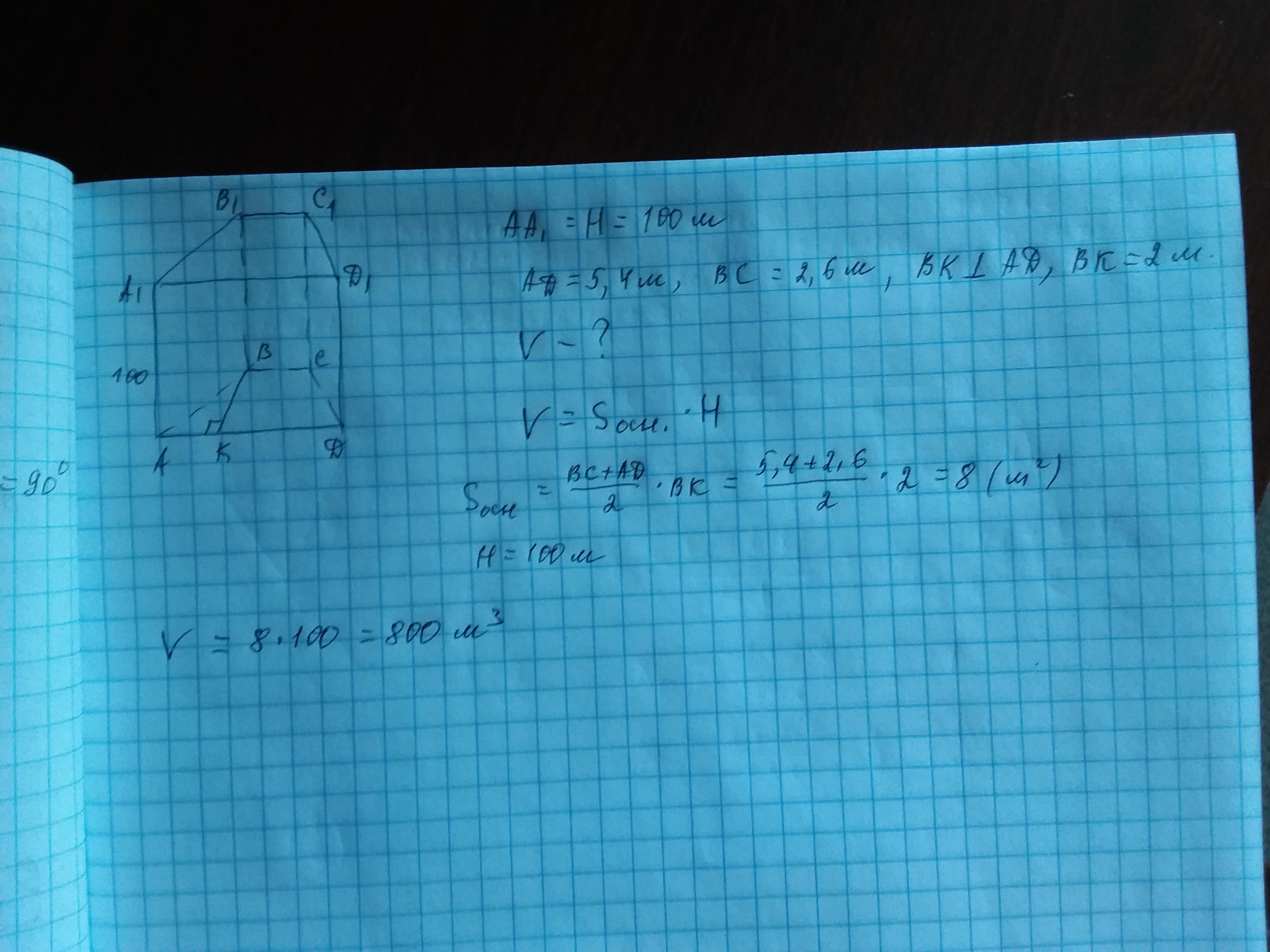 Сколько кубометров гравия потребуется для постройки железнодорожной насыпи длиной 100м, если ее сечение имеет вид трапеции с основаниями 5,4м и 2,6м, и высотой трапеции 2м?