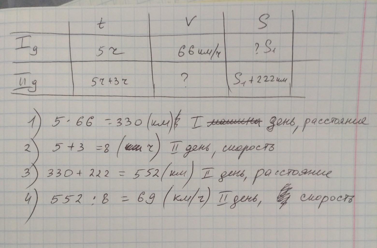 помогите пожалуйста отблагадарю)) первый день Машина находилась в пути 5 ч ехала со скоростью 66 км ч во второй день она была в пути на 3ч дольше проехала путь на 222 км больше с какой скоростью Машина ехала во второй день