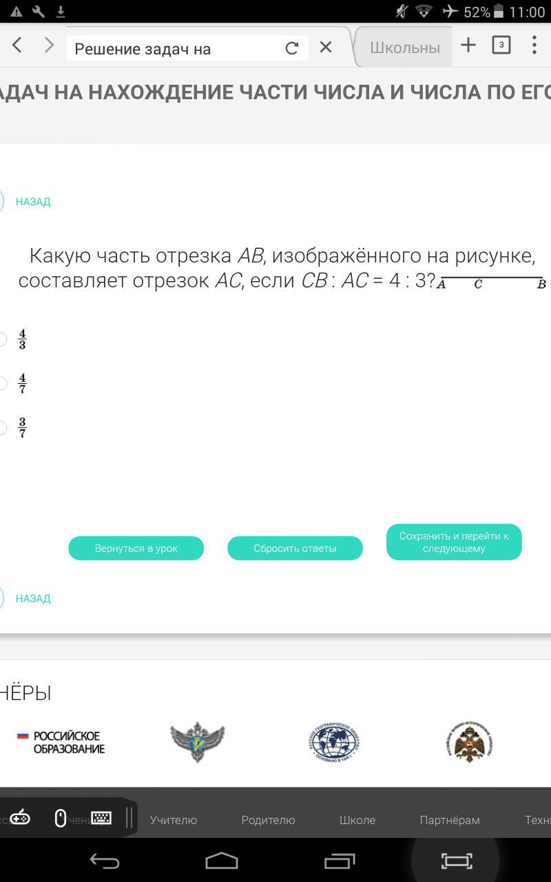 ДАМ ВСЕ БАЛЛЫ, ЛИШЬ БЫ РЕШИЛИ! Какую часть отрезка AB, изображённого на рисунке, составляет отрезок AC, если CB : AC = 4 : 3?