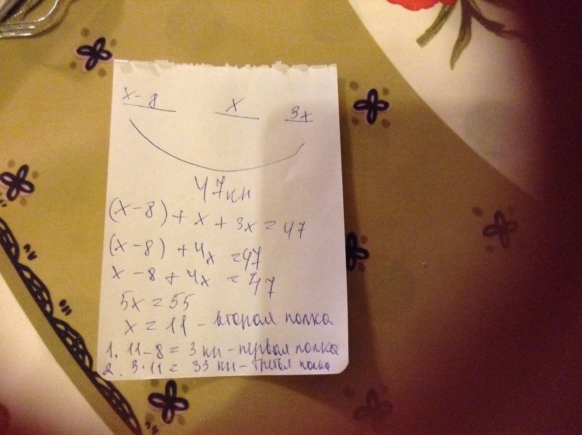 На трех книжных полках 47 книг. На верхней полке на 8 книг меньше, чем на средней, а на нижней--- в 3 раза больше, чем на средней. Сколько книг на каждой полке?