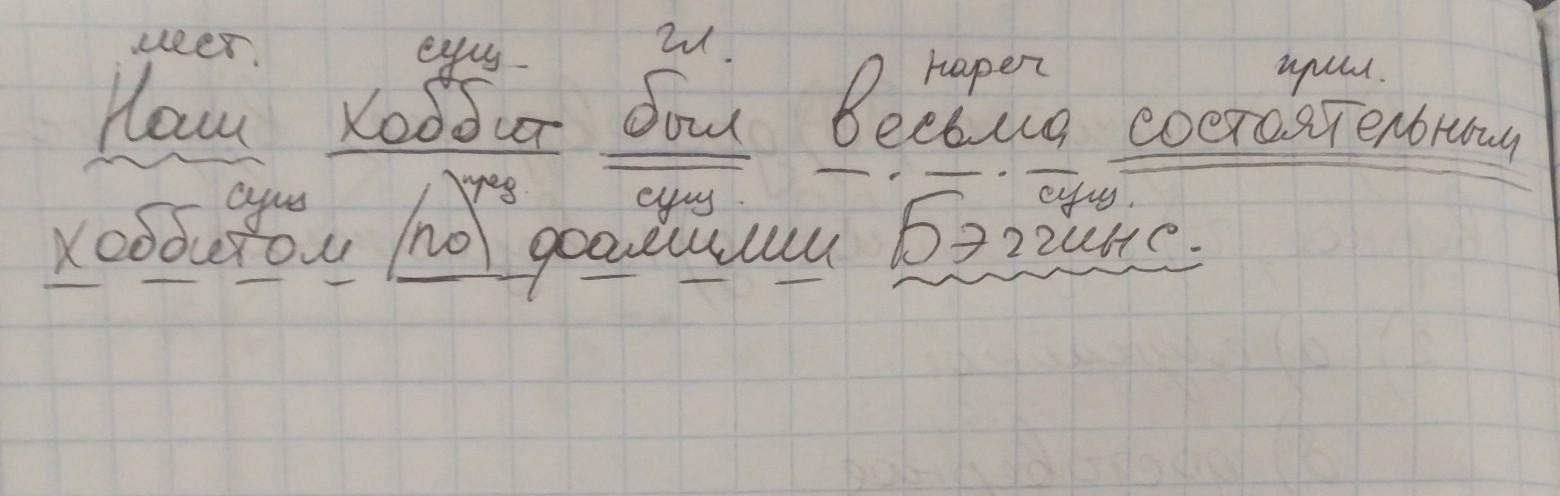 50 баллов! Наш хоббит был весьма состоятельным хоббитом по фамилии Бэггинс. Разобрать предложение по членам предложения!(ну типо определение это : состоятельным, хоббит это существительное.