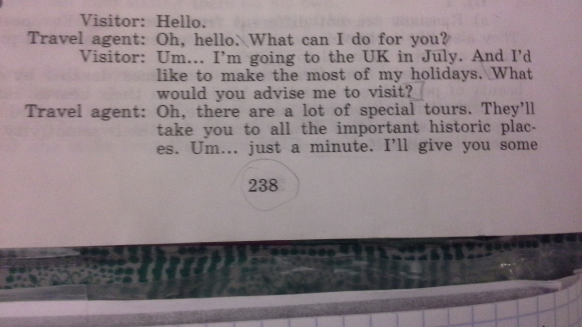 -Оу, существует очень много специальных туров. Они покажут вам многие важные исторические места. Эм..Минутку..Я дам Вам брошюрку. Вы сможете выбрать сами. Там много чего есть.