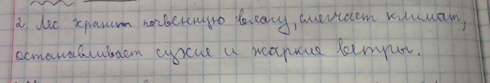 Лес (____) хранит (====) почвенную (~~~) влагу (- - - -), смягчает (====) климат (- - - -), останавливает (====) сухие (~~~) и (○, в кружочек, т.к. союз) жаркие (~~~) ветры (- - - -).