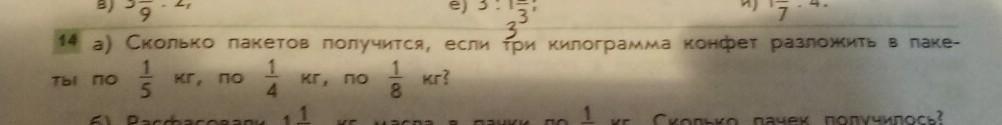 3.) 3 : 1/8 = 3/1 : 1/8 = 3/1 • 8/1 = 24/1= 24 (пакета) - по 1/8 кг.