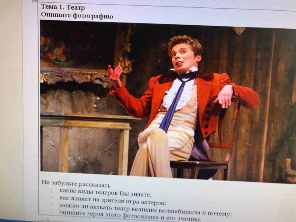 На этой фотографии изображён ярко-одетый мужчина. Он рассуждает о чём-то вслух. Актёр сидит на стуле в большем зале. Настроение у него хорошее, это мы можем понять по улыбке и выражению лица.