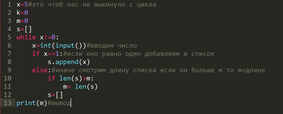 Пользователь вводит последовательность чисел.Признак окончания ввода 0.Вывести длину самой длинной последовательности подряд идущих единиц .НА ЯЗЫКЕ ПИТОН.ЖЕЛАТЕЛЬНО С ПОЯСНЕНИЯМИ.НА ШКОЛЬНОМ УРОВНЕ.