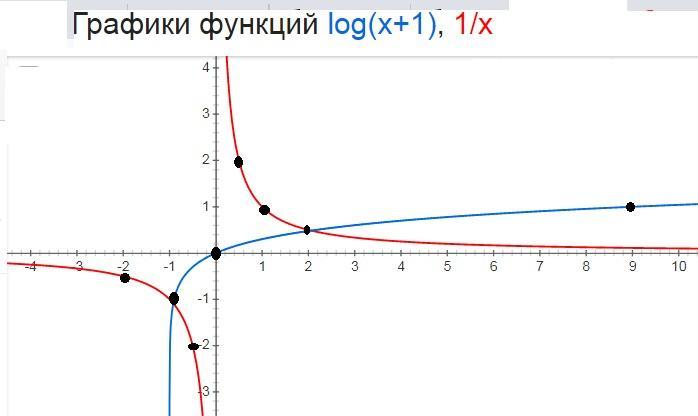 построим графики y=lg (x+1) и y= 1/x и найдем точки пересечения
