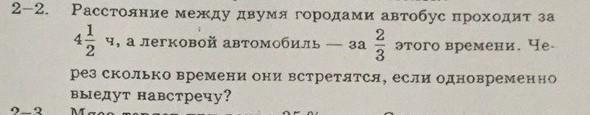 Расстояние между двумя городами автобус проходит за 4,5 ч., а легковой автомобиль - за 2/3 этого Времени. Через сколько времени они встретятся, если одновременно