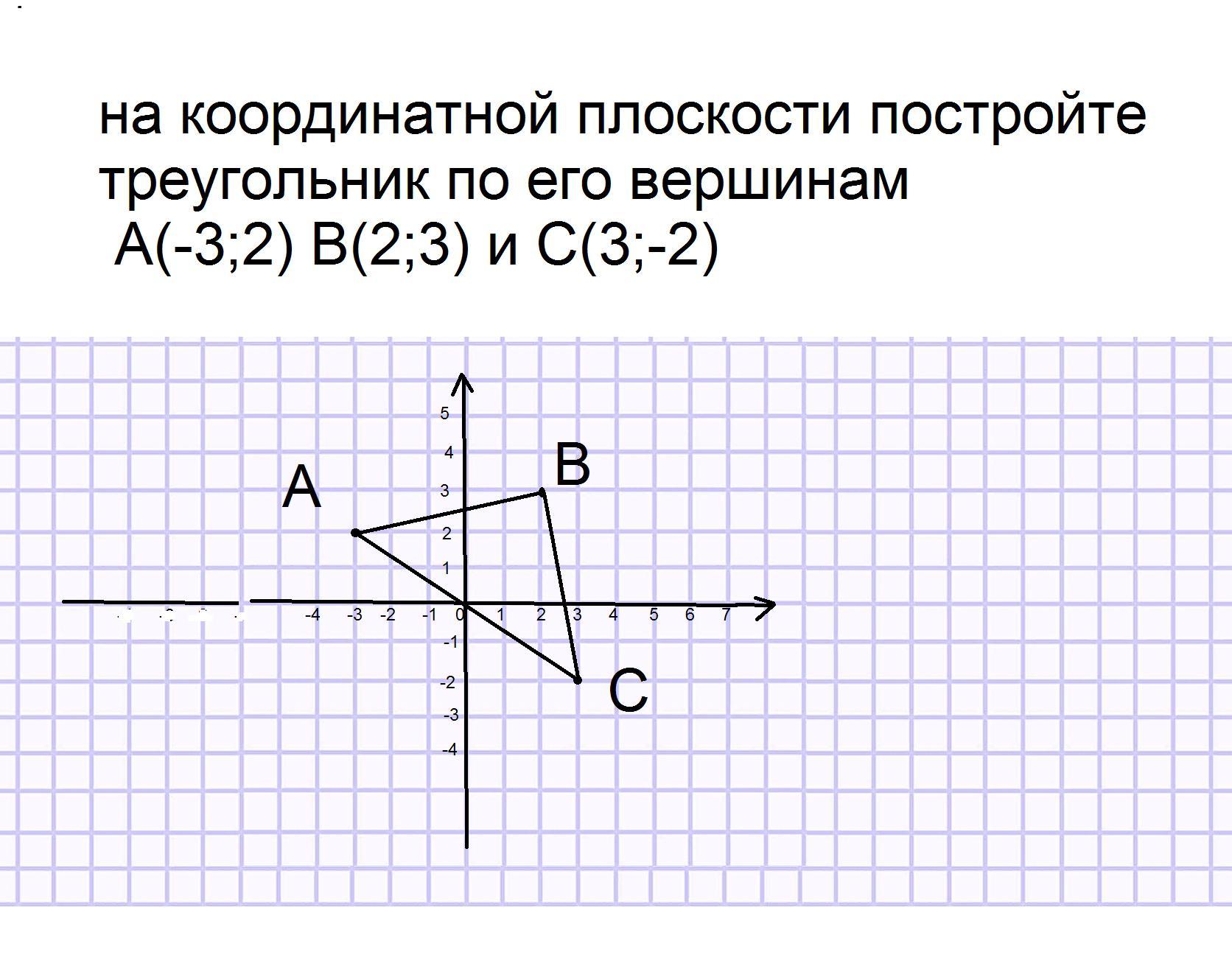 на координатной плоскости постройте треугольник по его вершинам А -3, 2 B 2, 3 и C3, -2