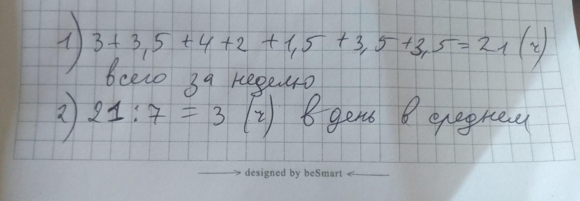 Вася решил следить за тем, сколько часов в день он ходит, поэтому завел дневник и всю неделю вел его. В понедельник он проходил 3 часа, во вторник - 3,5 часа, в среду - 4 часа, в четверг - 2 час, в пятницу - 1,5 часа, в субботу - 3,5 часа, в воскресенье - 3,5 часа. Как узнать, сколько в среднем часов в день Вася проходит?