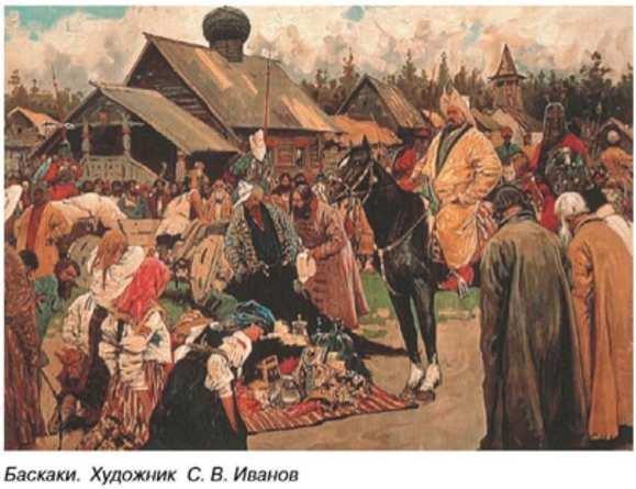 На картине С.В. Иванова мы видим , как в период монгольского ига на Руси собиралась дань. Специальный чиновник Золотой Орды , называвшийся баскак, собирает дань с русского населения.